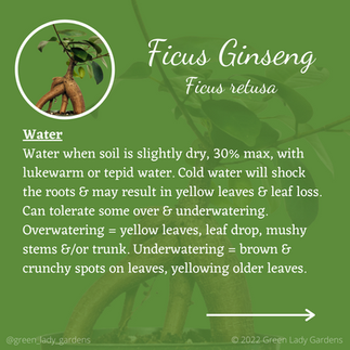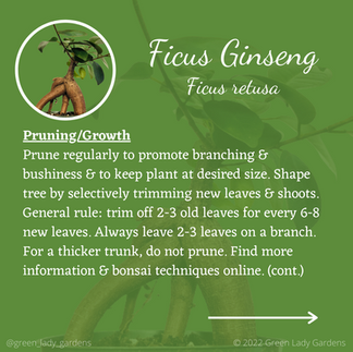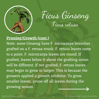 Note: some Ginseng have F. microcarpa branches grafted on a F. retusa trunk. F. retusa leaves come to a point. F. microcarpa leaves are round. If grafted, leaves below & above the grafting union will be different. If not grafted, F. retusa leaves may begin to grow in larger. This is because the growers applied a growth inhibitor. To grow smaller leaves, prune off all leaves during the growing season.