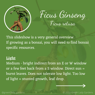 Ficus retusa, commonly referred to as ficus ginseng or ginseng ficus, is a very forgiving and easy beginner bonsai. Growing it as a bonsai means you will prune the tree to maintain a specific size and shape. It also means you will do different things with fertilizer and repotting that you don't do with most other houseplants. You will have to consult bonsai specific resources to learn more. There is entirely too much information to cover in this slideshow. If you don't want to grow your Ficus retusa as a bonsai, you can let it rage and grow it as you would other houseplants.